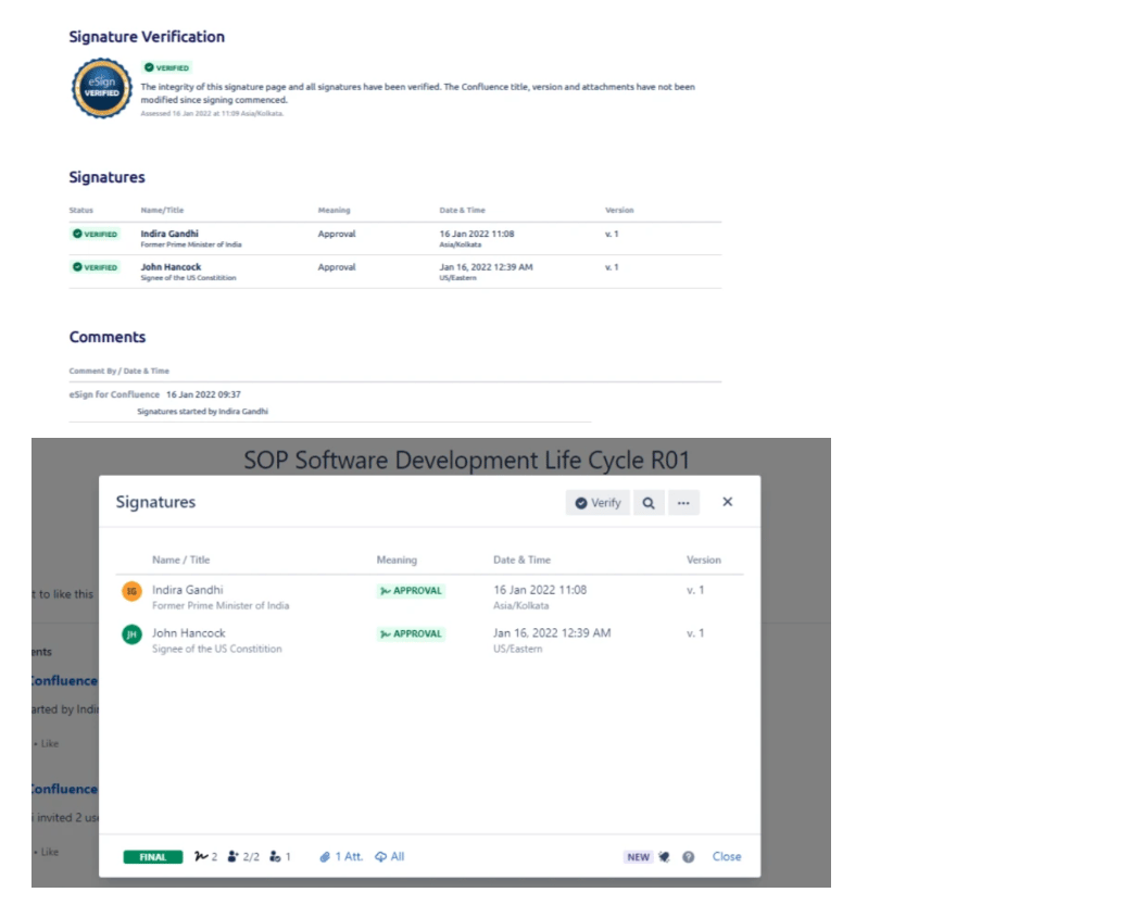 Content with open or finalized signatures is automatically labeled for easy search, and an optional macro can display the signature status directly on the page.