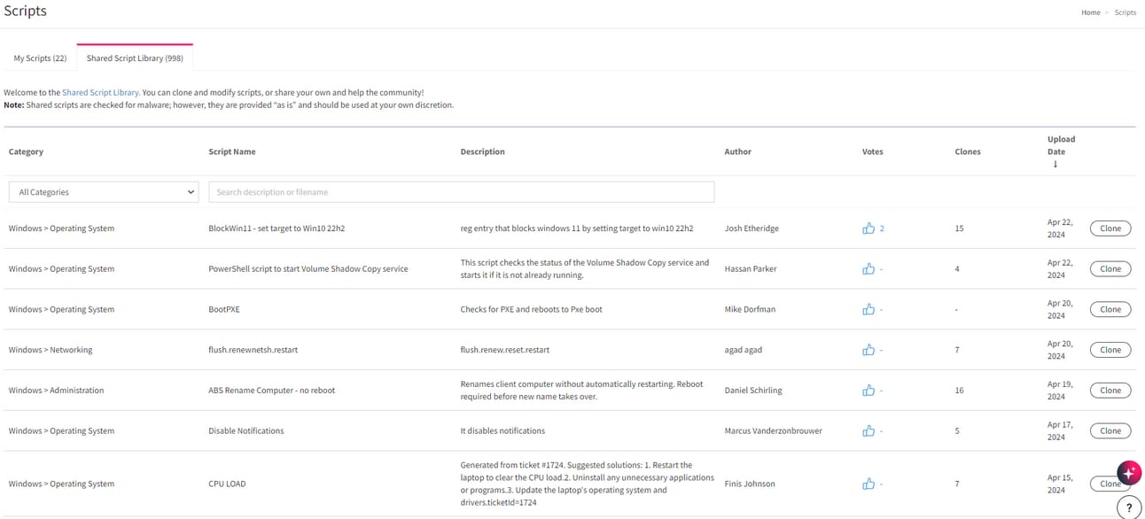 The Shared Script Library within ContinuousRMM enables users to leverage the collective knowledge and expertise of the ContinuousRMM community. It provides a repository of pre-built scripts that users can utilize to automate routine tasks, streamline workflows, and troubleshoot issues more efficiently.
