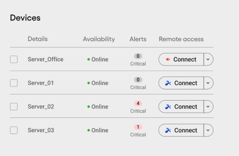 Remote access - ContinuousRMM integrates with several remote access solutions to provide IT administrators with the ability to manage, troubleshoot, and support client devices from any location. These integrations enhance the efficiency of IT operations, reduce response times, and improve overall service delivery by enabling seamless remote connectivity to end-user systems.