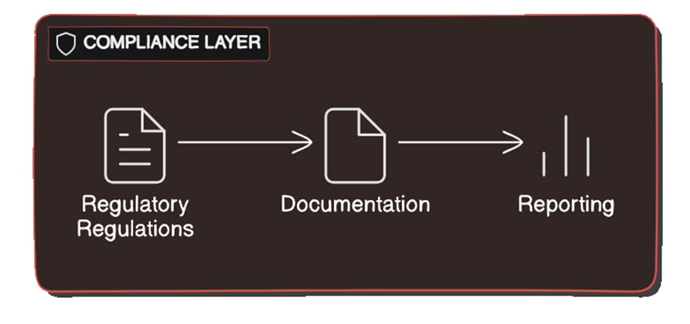 The compliance layer makes sure that GxP standards are followed by integrating regulatory requirements into the system. It has electronic signing, reporting, and documentation facilities.