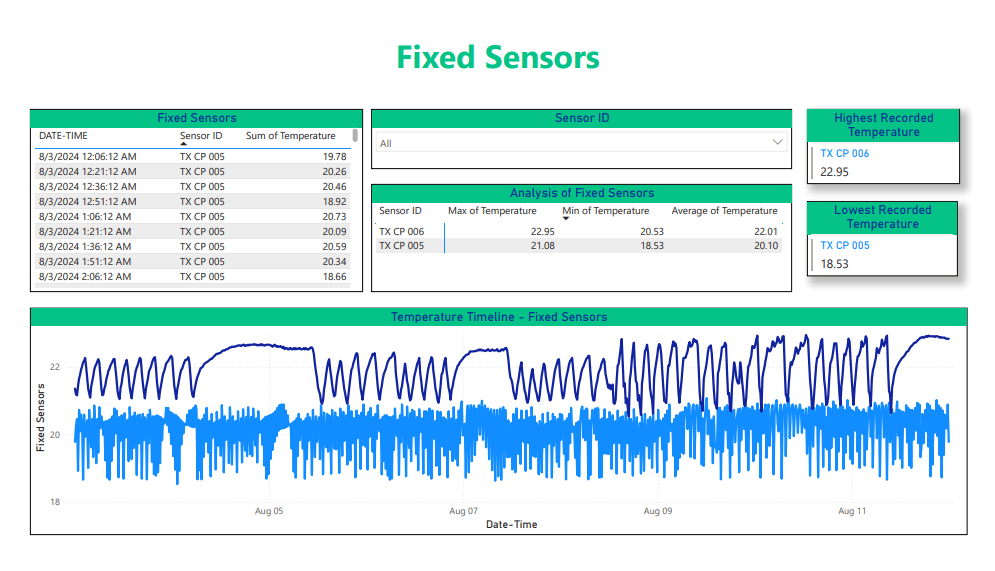 Temperature Analysis: An elaborate breakdown of day-to-day temperature readings, displaying the minimum, maximum, and average values for each sensor. This analysis ensures the proper functioning of all fixed sensors and their coverage of the designated areas.
