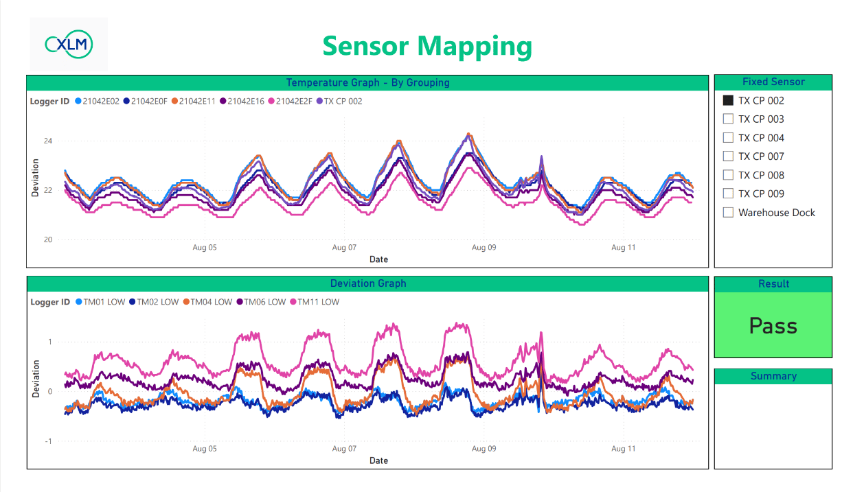 Deviation Graph: The deviation graph compares data from fixed and temporary sensors to ensure uniformity across various monitoring points. It flags any discrepancies exceeding 2°C lasting over two hours between fixed and temporary sensors, yielding a clear pass/fail outcome. This KPI is fundamental for validating sensor precision and guaranteeing that all sensors furnish dependable data meeting validation criteria.
