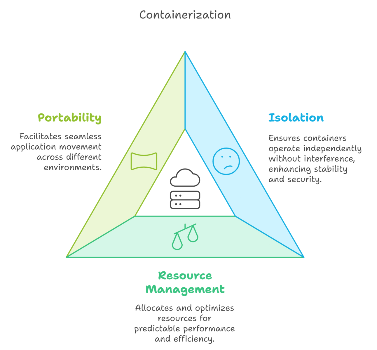 5. What are the key features that make containerization so advantageous? | Containerization offers several benefits: Isolation: Containers operate independently, preventing interference and ensuring stability. This includes process, resource, and security isolation. Resource Management: Resources are allocated specifically to each container, optimizing performance and ensuring efficient use. This includes dynamic allocation, predictable performance, and granular control. Portability: Containerized applications can be easily moved and executed across diverse environments without modification, thanks to cross-platform compatibility, simplified deployment, and version control. |