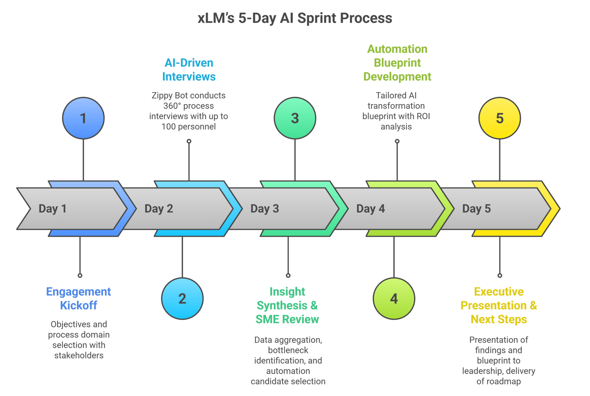A tailored AI-first process design is created, with ROI projections showing cost/time savings (e.g., reducing validation timelines by 70–80%).Day 5 – Executive Presentation