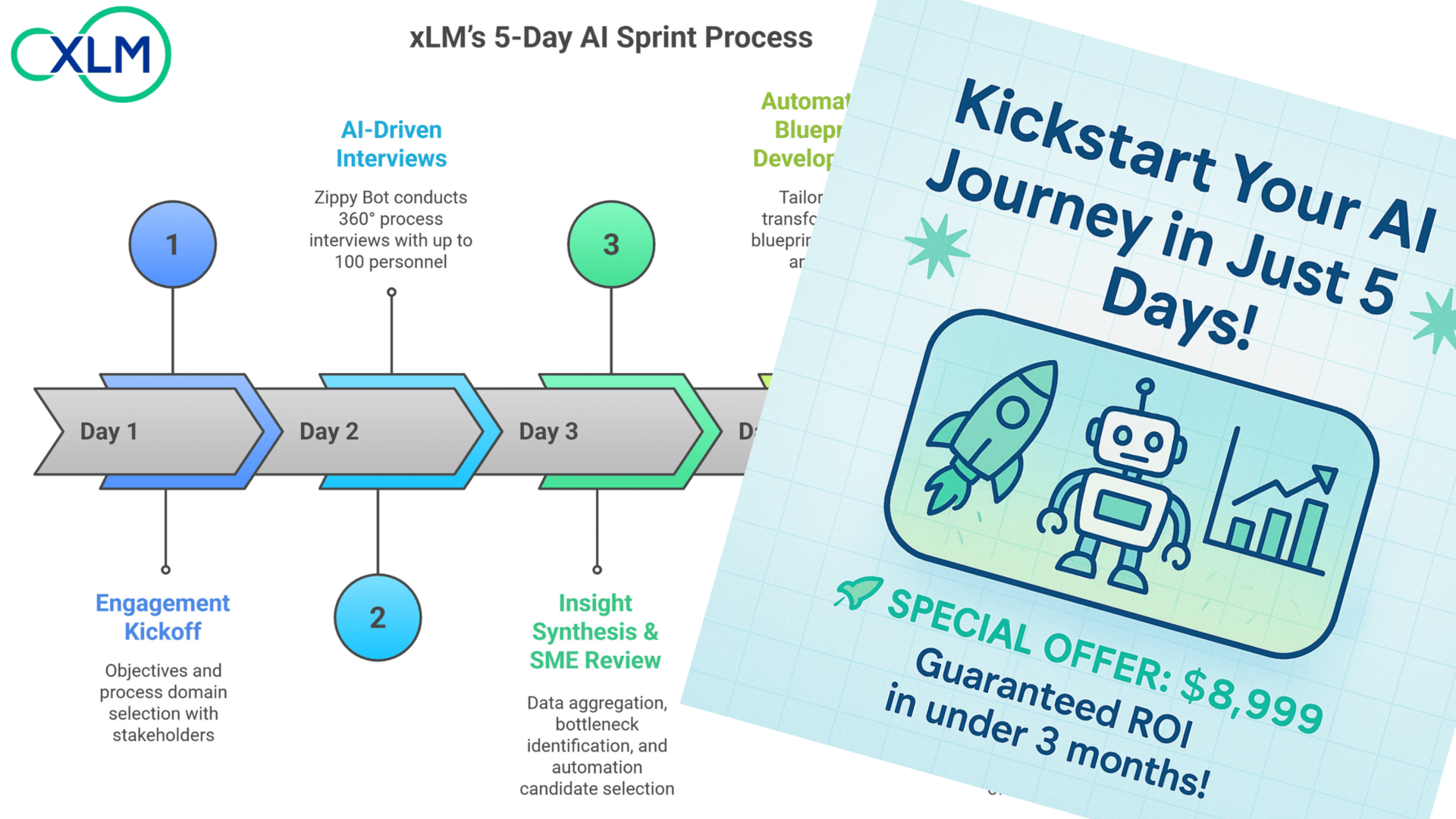 Kickstart your AI journey with a focused 5-day sprint tailored for small and mid-sized Pharma, Biotech, and Medtech companies. For just $8,999, xLM’s Audit-Automate-Accelerate engagement provides a custom AI transformation blueprint with guaranteed ROI in under 3 months.