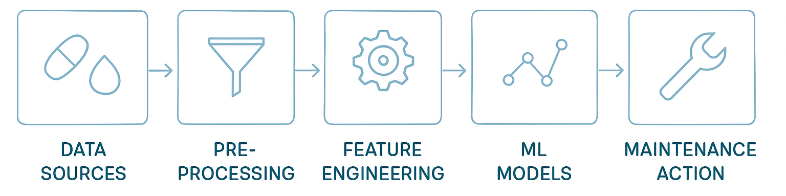 PdM uses data from sensors and IIoT platforms to predict equipment failures. By analyzing vibration, temperature, torque, and operational data, AI models forecast when motors, conveyor belts, or bioreactors might fail.