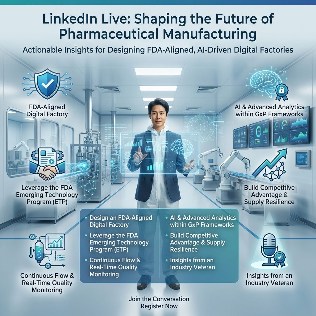 This unscripted, presentation-free podcast-style discussion is a timely conversation for pharmaceutical leaders seeking to improve manufacturing agility, strengthen supply chain resilience, and implement digital and AI-driven capabilities while maintaining GxP and regulatory rigor.
