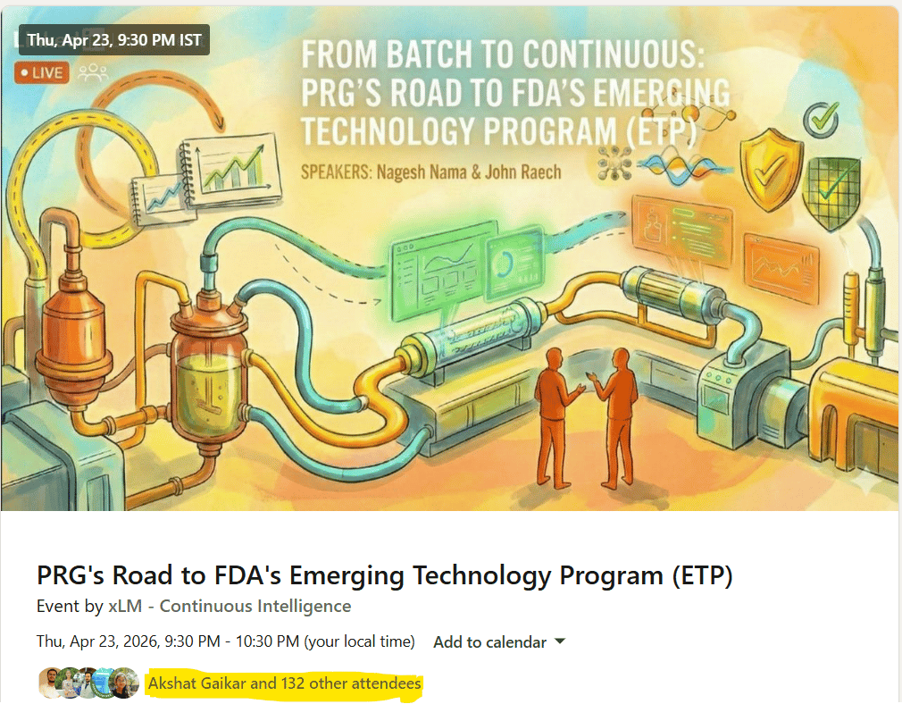 If your organization explores next-generation API manufacturing, continuous processing, or integrating digital and AI-driven technologies within regulated environments, this LinkedIn Live event offers practical insights from an industry veteran leading a state-of-the-art API facility in the U.S. Hear how innovation, regulatory alignment, and digital intelligence converge to shape pharmaceutical production's future.